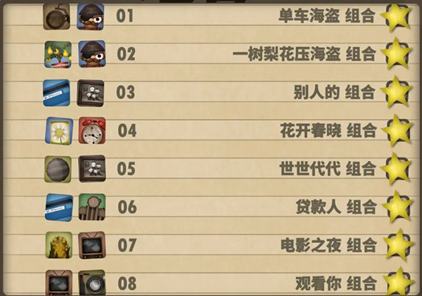 一、1—8组合:自行车海盗组合:Wooden Bicycle(1) Toy Pirate(1);别人的组合;Someone Else's Credit Card(1) Someone Else's Family Portrait(1);春眠不觉晓组合:Instant Seed Packet(1) Alarm Clock(1);世世代代组合:Spider Egg(1) Someone Else's Family Portrait(1);贷款人组合:Someone Else's Credit Card(1) Blankity Bank(1);夜场电影组合:Corn on the Cob(1) Television(1);远航组合:Toy Pirate(1) Oil Barge(2)