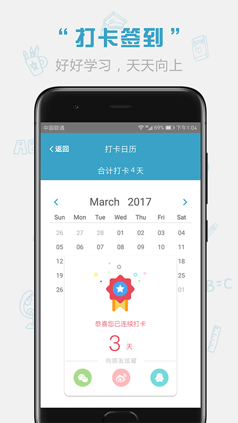每日签到,记录学习情况,通过考勤,督促用户坚持学习。