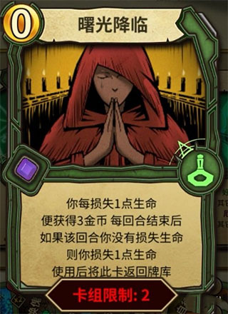 具体思路:每个阶段若曙光出现早则配合回血刷钱,若曙光出现则考虑下一阶段再用;心灵狂暴用于快速抽牌出曙光,利用锁血回血卡配合曙光反复产钱。
