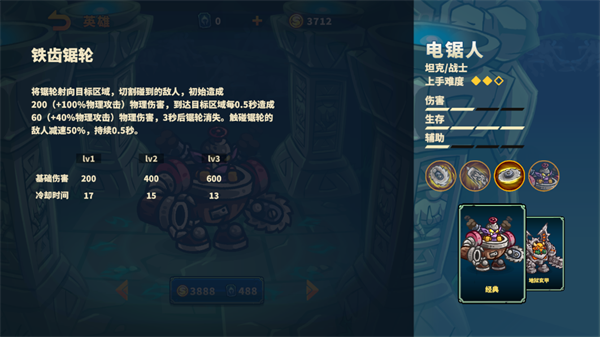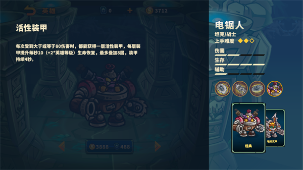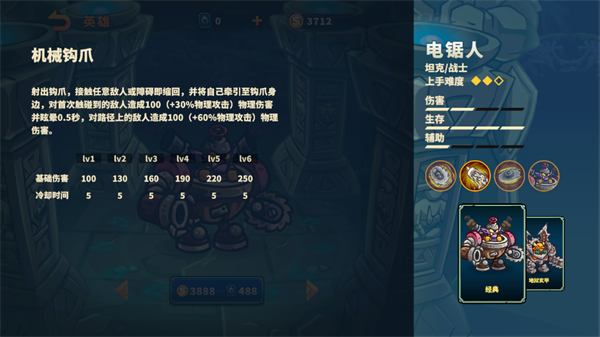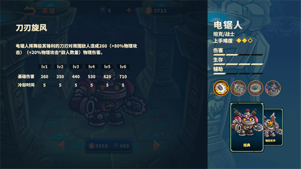 电锯人是一位坦克/战士类型英雄,其拥有超强的生存能力,也有一定的输出能力
