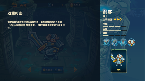 剑客每第4次攻击将进行双重打击,第二段攻击对敌人造成物理伤害。(第二段攻击附带50%装备特效)