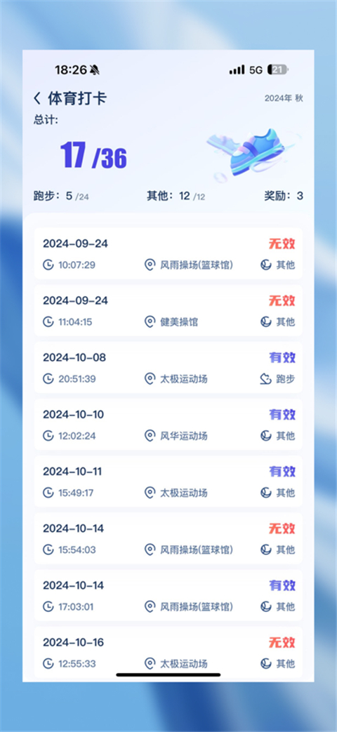 无需连接校园网即可查看自己的体育打卡次数,体育打卡记录清晰明了。
