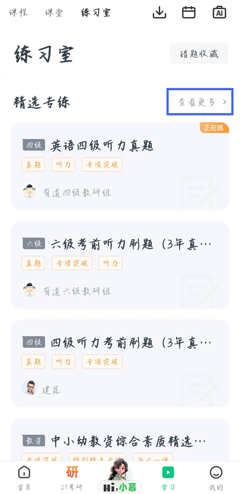 2、然后在精选专练处,点击查看更多。