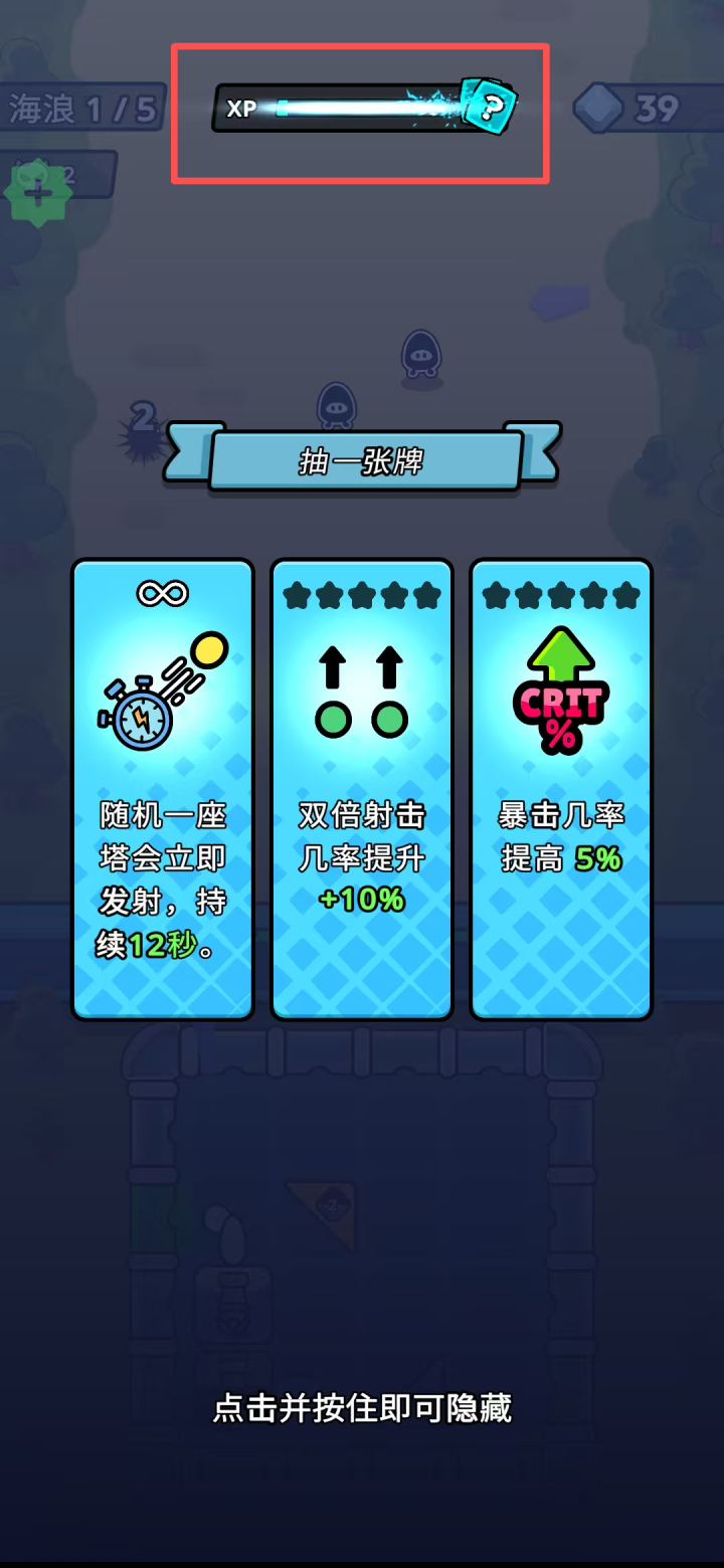 4、通过击败敌人可不断累积XP,当经验值满后即可触发抽卡环节,玩家可根据当前战局选择合适的卡牌技能进行强化。