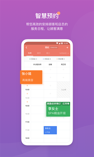 连接微信、美团、大众点评帮助商户快速的接收和确认预约,智能安排店员与顾客的服务日程。