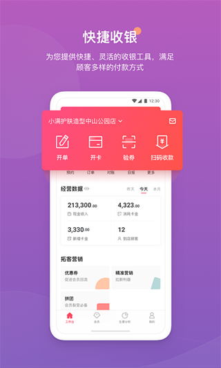 提供多样的营销工具,发券、拼团、短信营销、微信公众号,帮老板拉更多的新客、让会员更愿意到店服务。
