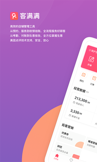 客满满App是美团点评专为美业商户设计的店铺管理系统。软件可以全方位协助店铺,全面提高管理水平,方便他们对店员的安排以及管理,给顾客带来更好的服务。客满满app还采用了智能化的工具,可以帮助用户对店铺进行数据分析,提供一些经营方法供用户参考,让用户更好的了解和满足顾客的需求,提高客户满意度,增加店铺的生意。
