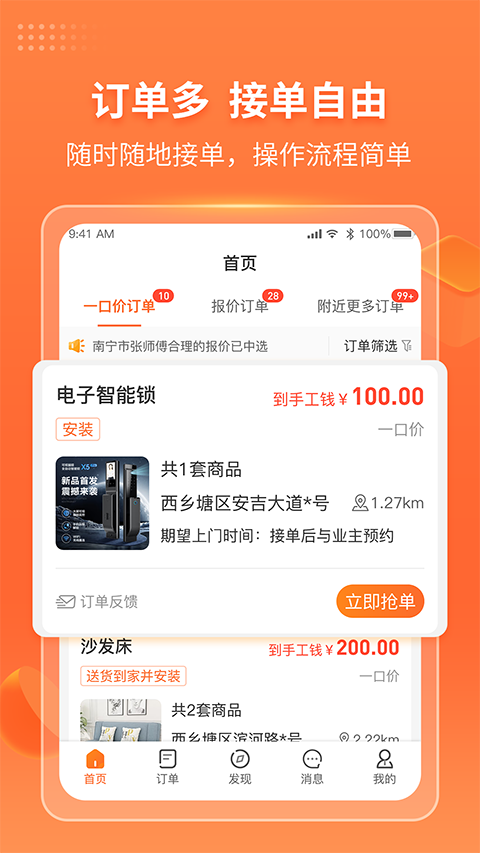 工奇兵师傅接单平台App通过高效的匹配订单机制,可帮助师傅快速找到合适工作,从而提升接单效率,让有一技之长的师傅能更轻松、稳定地获得收益。欢迎有需要的师傅下载使用。