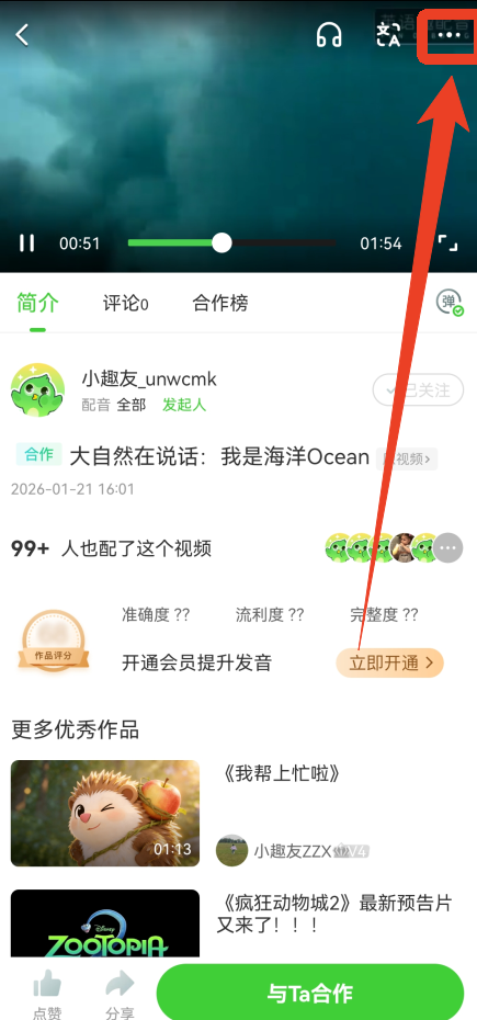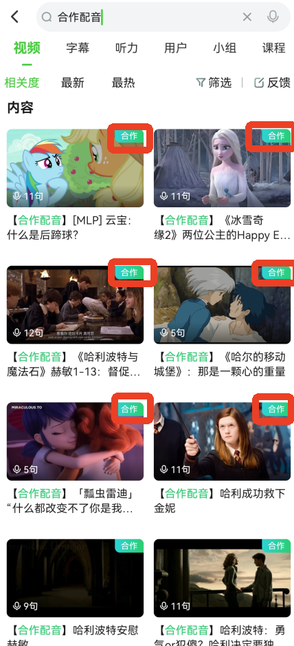1、直接搜索合作配音,会有很多开启合作模式的配音视频,一般会显示在视频页面的右上角。