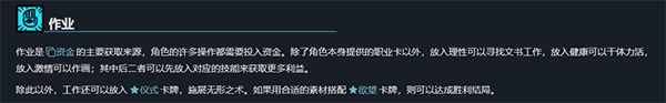 玩家可使用的基础资源有四种,即健康、理性、激情、资金。许多操作将会消耗这些资源,其中前三者属于能力,通常不会真正消耗,只是需要时间恢复;资金则需要通过各种渠道补充。