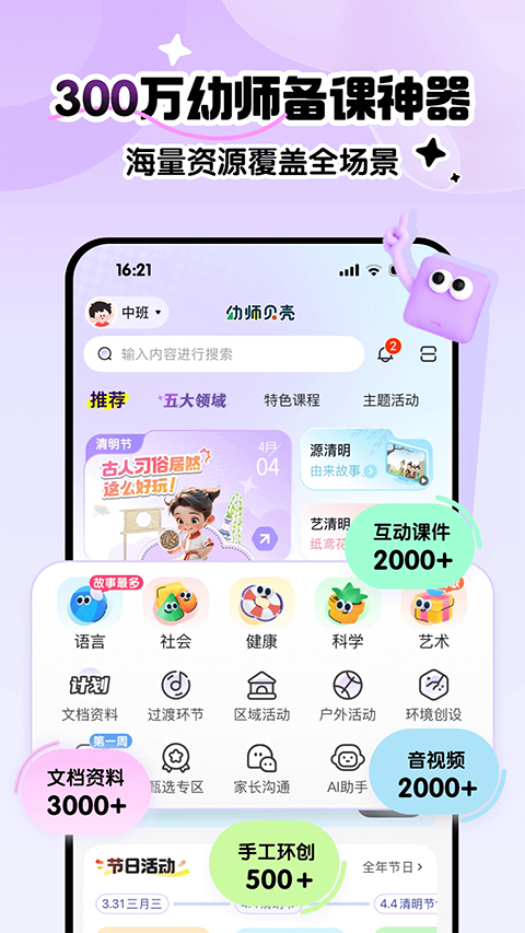 1、多元体系课程:幼师贝壳App根据小、中、大不同年龄段发展特点设计的高质互动课件1000+,涵盖幼儿园高频活动主题,同时提供安全教育、24节气、幼小衔接等特色体系课程,实时紧跟热点,持续更新内容,满足老师五大领域教学所需;