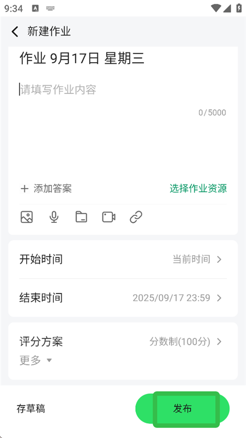 3、填写作业内容、以及开始结束时间,点击发布即可。
