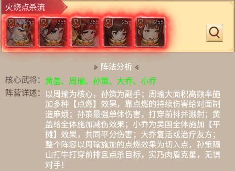 特点:周瑜高频挂【点燃】打持续伤,孙策切前排+点杀,黄盖全体减伤+分摊伤害,大乔复活治疗,是靠“点燃”持续输出的肉盾克星阵。