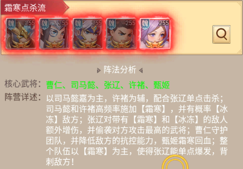 特点:司马懿/许诸高频挂【霜寒】+【冰冻】控场,张辽对带DeBuff的敌人额外增伤+偷攻,曹仁护队降抗控,甄姬回血,靠“霜寒”联动实现单点爆发+背刺。