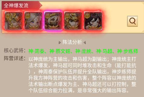 特点:神庞统主打法术爆发,神马超能打能抗还带控制;神周泰保护全队,神蔡文姬抬血,神步练师提升攻击,是综合能力拉满的输出阵。