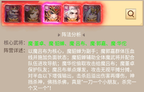 特点:魔吕布是核心单点爆发(攻击无视分摊),魔郭嘉压血线+挂负面,魔貂蝉辅助全队,魔华佗偷攻给吕布,魔董卓保队友,斩杀后溢出伤害再爆伤,是“一刀一个”的暴力阵。