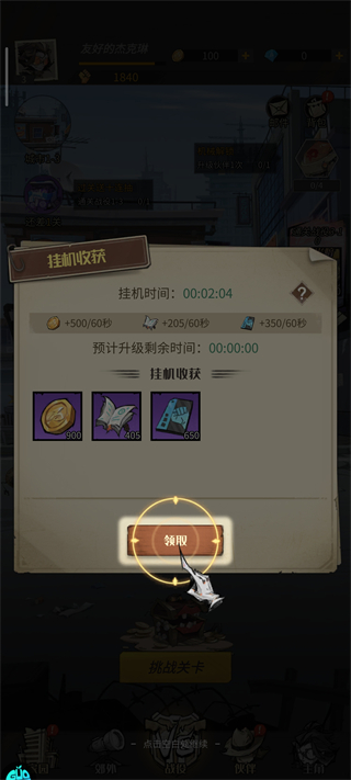 领取挂机收获,积累金币、经验和升级材料用于提升角色。