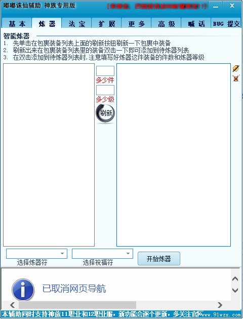2.炼器过程中可以直接更改选择框里的装备或道具, 无需暂停在开始, 其他功能也一样.