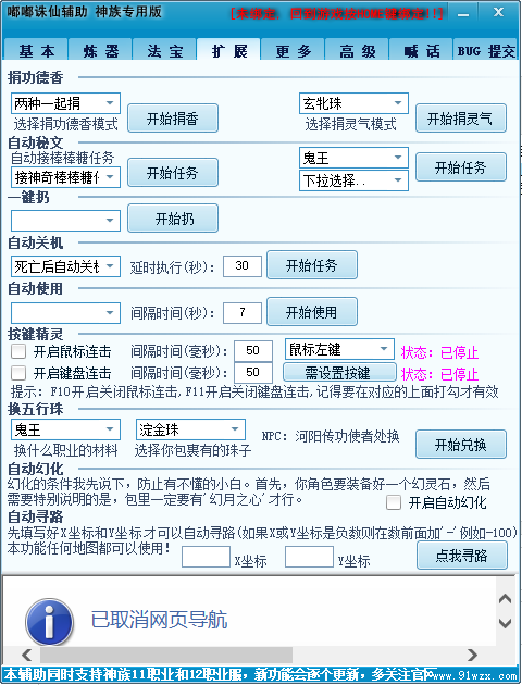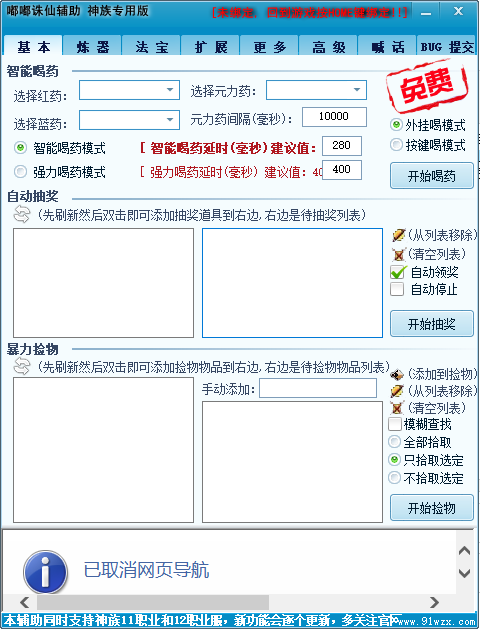 嘟嘟诛仙辅助是一款针对大型角色扮演类网络游戏“诛仙”的辅助工具,与其他游戏的辅助工具不同的是,它非常智能化,包括喝药、自动抽奖、暴力捡物、炼器、法宝等多项辅助功能都可以自动完成,无需玩家手动操作,非常便捷,当然这前提是你的绑定你的游戏,在窗口模式下按HOME就可以实现咯,非常简单,同时它还是职业神族专用版,兼容11职业神族哦,可按F12键呼出隐藏工具,Shift+F12直接退出本工具,Shift+F11隐藏游戏等快捷键操作,并且它是完完全全免费的,无需花钱购买即可使用所有功能。