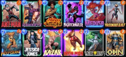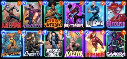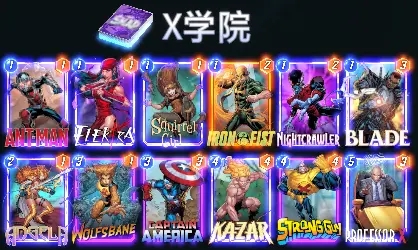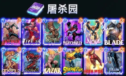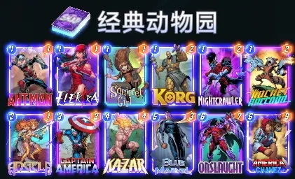 关于哪一个才是经典版本,也是众说纷纭,我们这就把MarvelSnapZone上推荐的版本当做经典款吧。这套牌是在上面的基础上,把1费牌加到了6张,同时带了狂攻去给卡扎尔和蓝惊奇的持续效果加倍,属于在铺场然后buff这个思路上走的最远的一个版本。