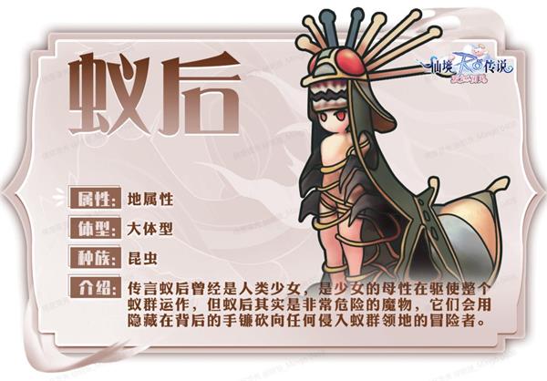 曾是人类少女的传说中蚁后,如今被母性支配着整个蚁群。然而,这份母性之下隐藏的是极具危险性的魔力。在她的统领下,蚁群如潮水般席卷而来,她们以手镰攻击任何侵犯领地的冒险者。少女的容颜下隐藏着无情的魔物本质,是森林深处真实而可怖的威胁。