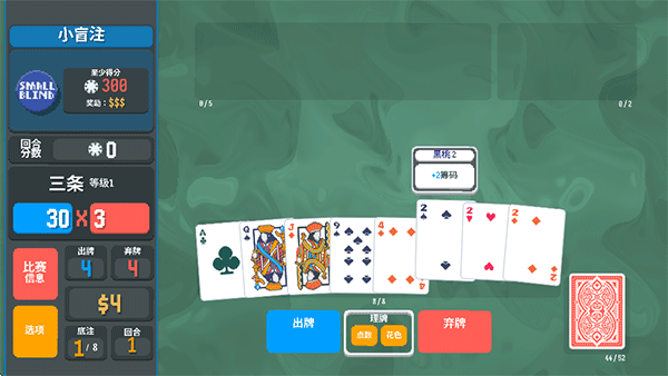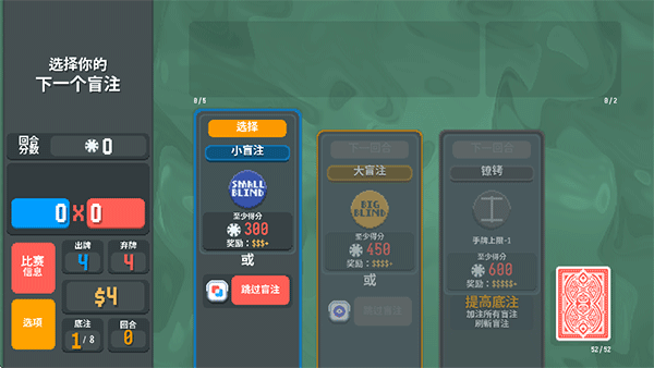 7、回合结束后若达到盲注要求相应分数即为胜利;