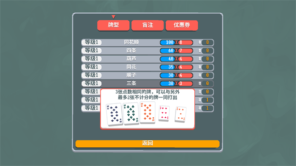 描述:3张点数相同的牌,可以与另外最多2张不计分的牌一同打出;