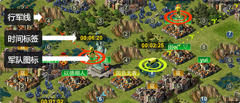兵线的显示包括:行军线、军队图标和时间标签。如:
