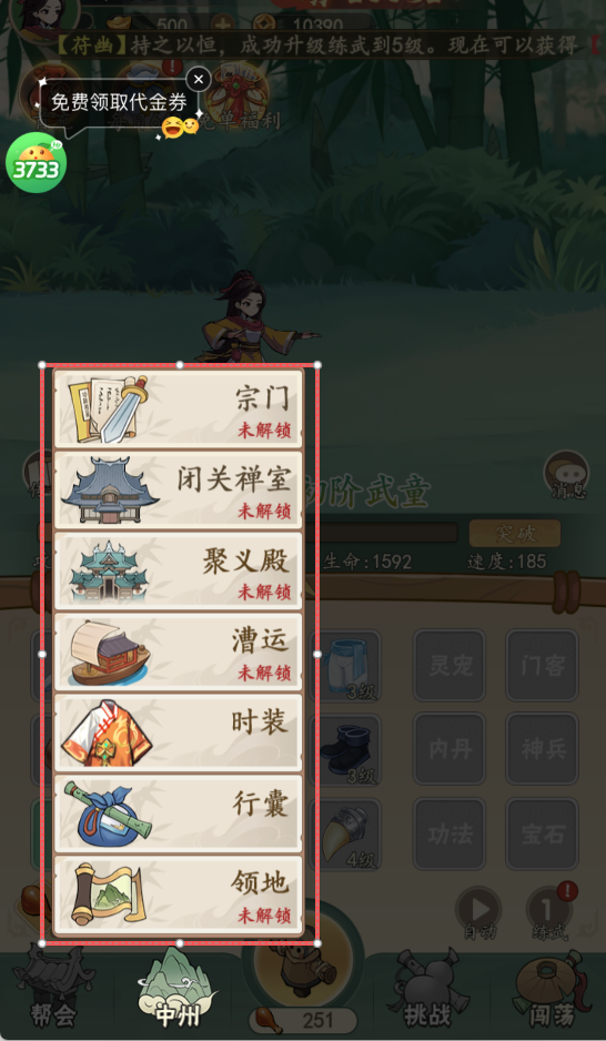 随着主线的推进,游戏中需要通过完成主线解锁门客、宗门等玩法拓展养成维度。