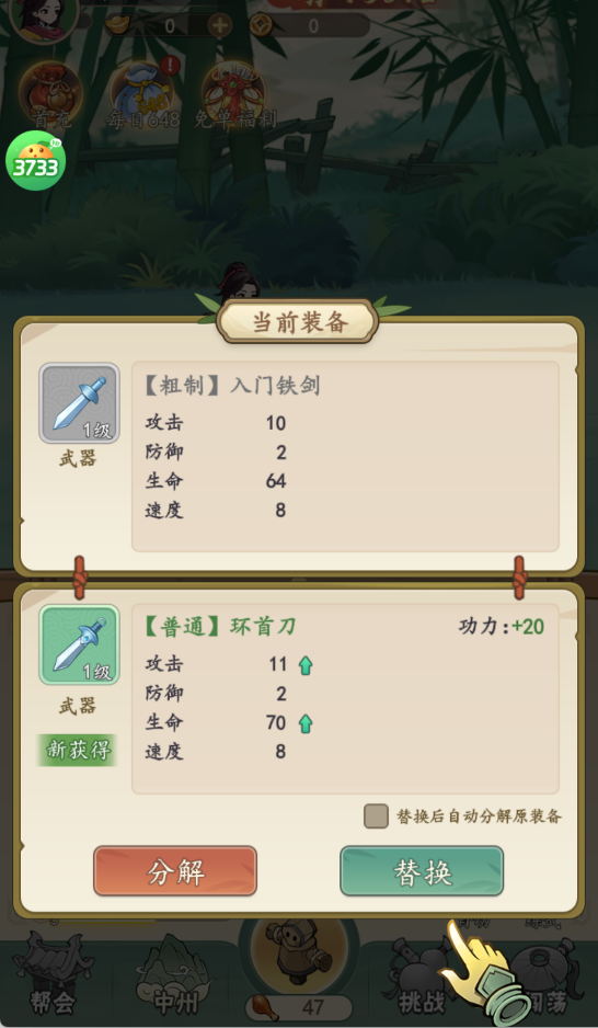 用新获得的【普通】环首刀替换旧武器,提升攻击、生命等属性,替换后可选择分解旧装备换资源。
