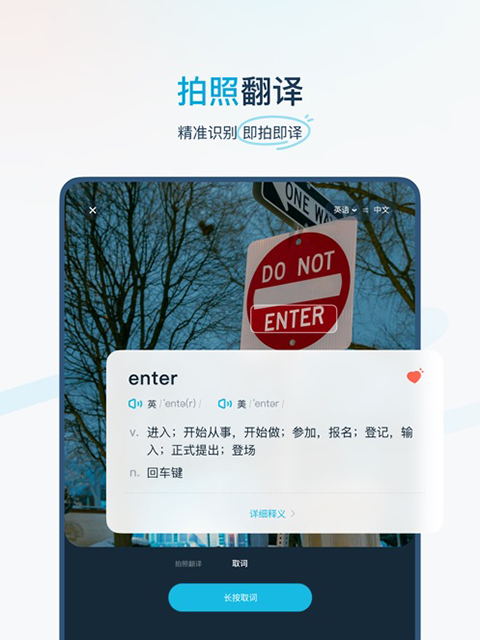 3、拍照翻译——配备强大的摄像头取词和拍照翻译功能,一拍即译无需手动输入便可快速获取翻译结果;