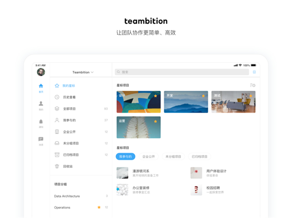 teambition ipad版是一款专为iPad用户使用的办公协作app。目前软件已经在网页、电脑、手机各个终端都已经退出相应的客户端,用户可以跨平台进行高效办公啦。软件是2015年度的精选应用,也是目前最领先的土堆协作工具,已有超百万的项目在使用teambition啦。无论你是想要开发一个产品还是想要进行婚礼策划,teambition ipad版都能满足你的需求。软件操作简便,只需先创建一个项目名称,然后将团队成员拉近群里就可以进行文件共享、即时沟通交流、任务同步等等操作。如果你平时需要跟多个人进行协同沟通的话,小编强烈推荐大家使用这款teambition ipad版,相信你的工作一定会事半功倍的。