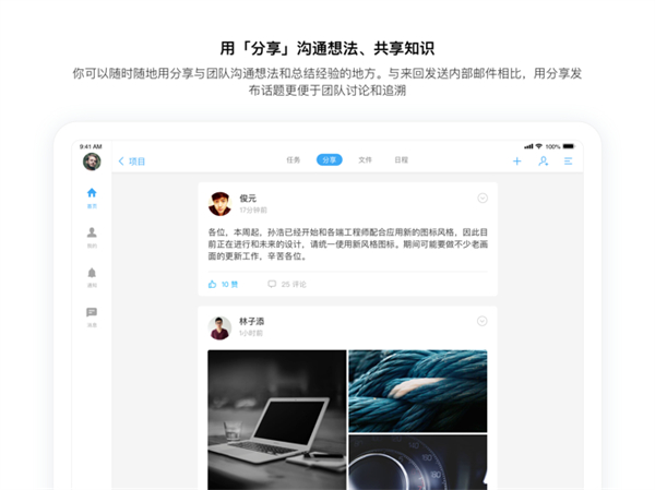 你可以轻松发布「分享」来和团队成员沟通想法、共享知识。每一篇分享在更新时,系统会实时通知所有相关的成员。