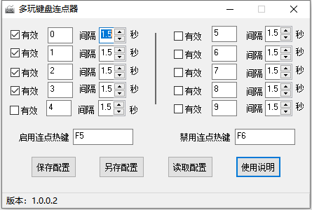 多玩键盘连点器绿色版是一款简单实用的键盘点击器,这款软件可以模拟键盘点击,你可以随意设置10个快捷键,还可以设置快捷键之间的连点时间间隔,非常适合经常使用键盘工作的上班族或者喜欢打游戏的朋友使用。而且软件操作简单,只需要在按键动作前面勾选 " 生效 ,然后再输入对应的按键,并设置连点时间间隔,就会自动帮你模拟键盘点击了,需要的朋友可以在本站下载,本站提供多玩键盘连点器绿色版下载,无需安装,双击软件即可使用,欢迎大家下载。