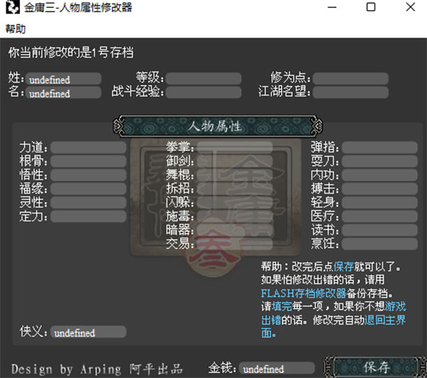 金庸群侠传3修改器是针对金庸群侠传3的游戏辅助工具,它能够修改游戏中人物的所有属性、等级、经验和江湖名声等等数据,还能将金钱、经验等修改为无限。