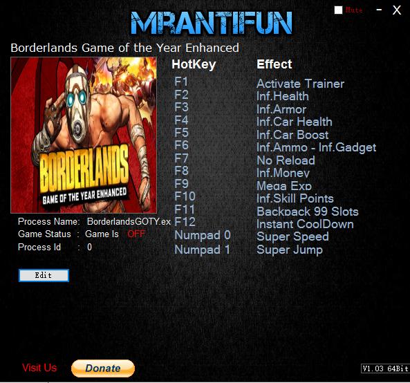 无主之地年度版十三项修改器是为无主之地游戏所打造的辅助工具,该修改器支持十三项修改属性,可以实现以下功能,包括无限生命、无限护甲、无限车辆生命、无限弹药、无限汽车加速、无限金钱、技能立刻冷却等,让你轻松刷刷刷,重温高清经典。可以自定义的内容包括了任务目标,武器配置,敌人数量,掉落物品种类,几乎所有游戏中出现的要素都可以按照自己的喜好进行修改。但是要注意的是,开启一些功能,会严重破坏游戏的平衡,失去游戏乐趣,请慎重选择需要使用的功能,这样不仅可以帮助你更容易的进行游戏,还能继续享受游戏给你带来的刺激。