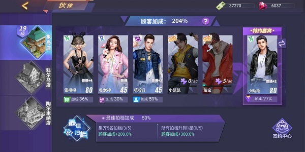 老板们想获得其他帅气漂亮的合伙人,可在游戏中的签约中心去签约他们哦,在更换按钮选项更换自己喜爱的店长,连续签约10份必出强力人才签约达到99次更有店长来袭,让合伙人更快的与你相见,为你的餐厅保驾护航。