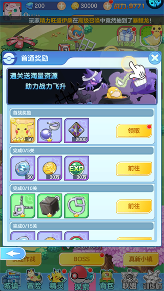 通关关卡可领取皮卡丘、资源道具等首战奖励,完成5关、10关、15关等里程碑还能获得大量金币、经验、装备等资源。