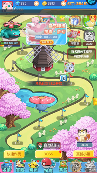 角色达到18、56级可开启联盟、训练师功能,同时首充可获得神兽梦幻,加入联盟后可参与联盟活动,提升训练师等级解锁更多玩法。