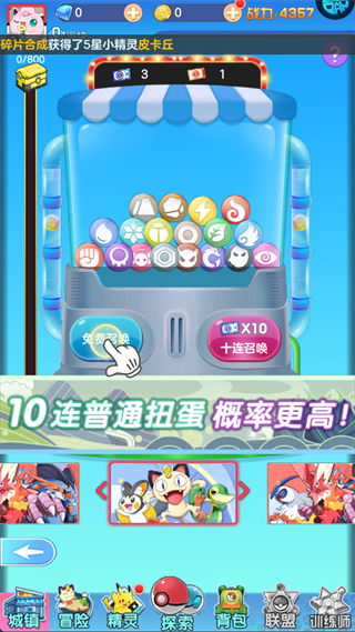 可通过招募商城获取宝可梦,十连召唤概率更高,还能通过碎片合成获得5星皮卡丘等强力精灵。