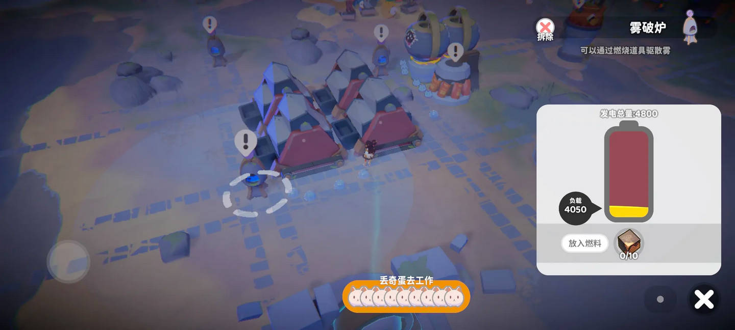 只放1个石头厂、1个木厂就够用,位置尽量靠近下方小岛连接处。如果刷新蛋点的话就近贴脸放采蛋器,一般一蛋对应2-3个煎蛋器,可以保证一天采集完,离得远或者懒得调的话就在石厂木厂旁边放4个煎蛋器,效率低一些但是省心。