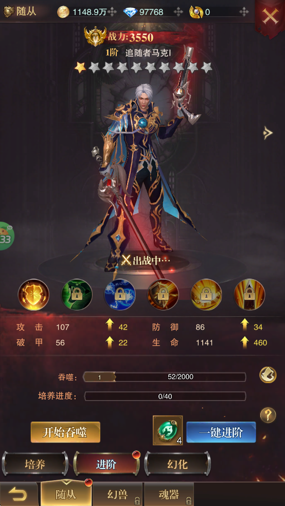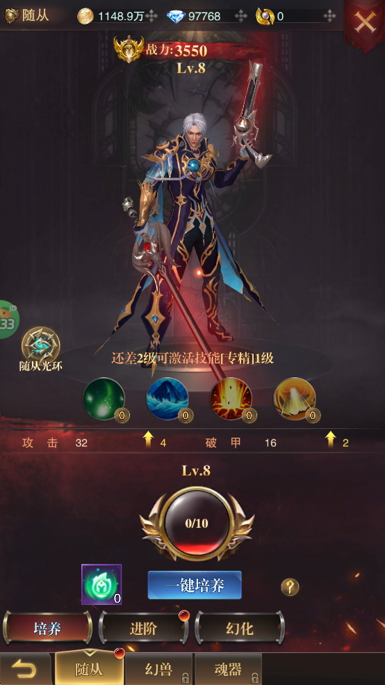 消耗随从进阶精华会增加进阶进度,培养满后升星成功。