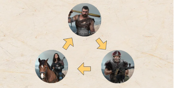 三大兵种形成了三角循环的克制关系:步兵克制射手、射手克制骑手、骑手克制步兵。