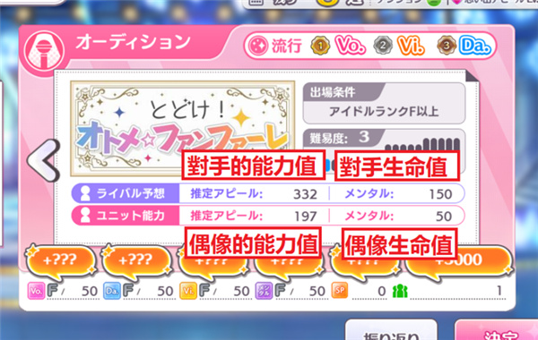 在选择参与那个试镜的画面,会看到对方及自己的不同能力值。如果发现对方能力值或生命值远高于自己,你可能就应该去培育一下偶像或选择更低难度的试镜了。