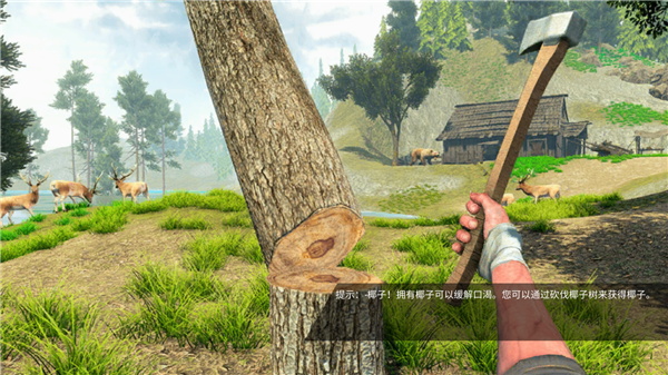 2、所以,你认为你可以在这个生存游戏岛上生存吗?永远不要失去希望!制作坚硬的木斧砍伐树木,收集木材作为火,喝椰子水,吃树上的苹果。