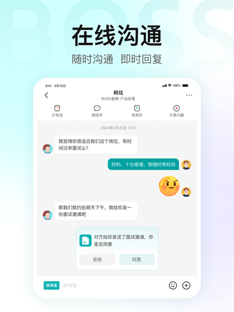 Boss直聘ipad版是一款互联网时代的招聘神器,你还在通过一轮轮的面试找工作吗,有了Boss直聘,让你轻松对接企业高管,直接与boss开聊。如果谈不来,那就直接换boss。软件为广大应聘者提供海量工作岗位,日均60万的在线职位等你。软件致力为企业和应聘者进行自动精准匹配,软件只需登记注册一个账号,可以用软件制作一个具有个性化的简历后就可以直接与招聘boss开聊啦。目前有超多知名企业高管都在这里发布了职位,例如阿里巴巴、百度、美团、华为、果壳、网易、知乎,还有新锐公司都一网打尽,超多高薪职位等你来应聘哦。