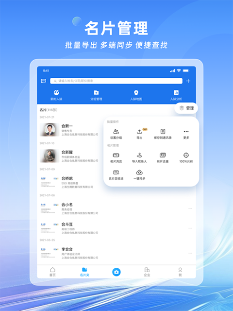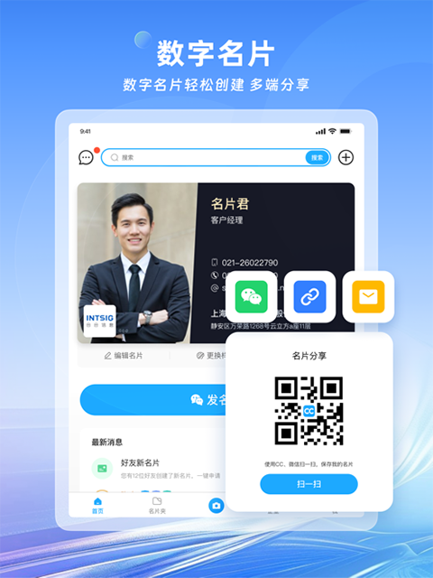 在手机、平板、网页等不同终端登录,所有名片随时随地更新,无缝隙同步