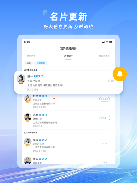 名片联系人的公司职位联系方式有更新时,即时给您发送提醒,让您可以及时送出祝贺,保持人脉新鲜。