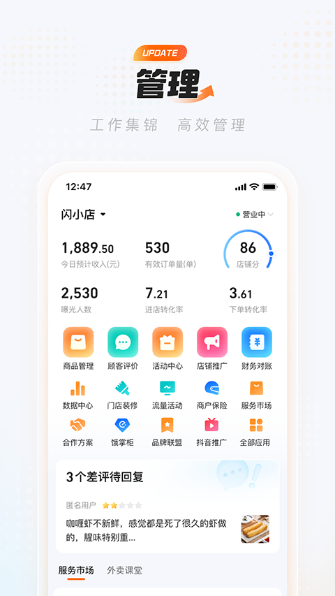 为商家您提供丰富的商品管理、顾客评价、门店装修、数据中心、活动配置等实用功能。
