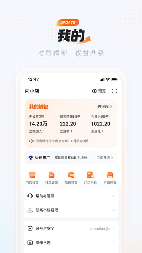 呈现店铺门店的基础设置,打印机设置,门店营业设置等。钱包功能,整合账单、食安险等相关功能。